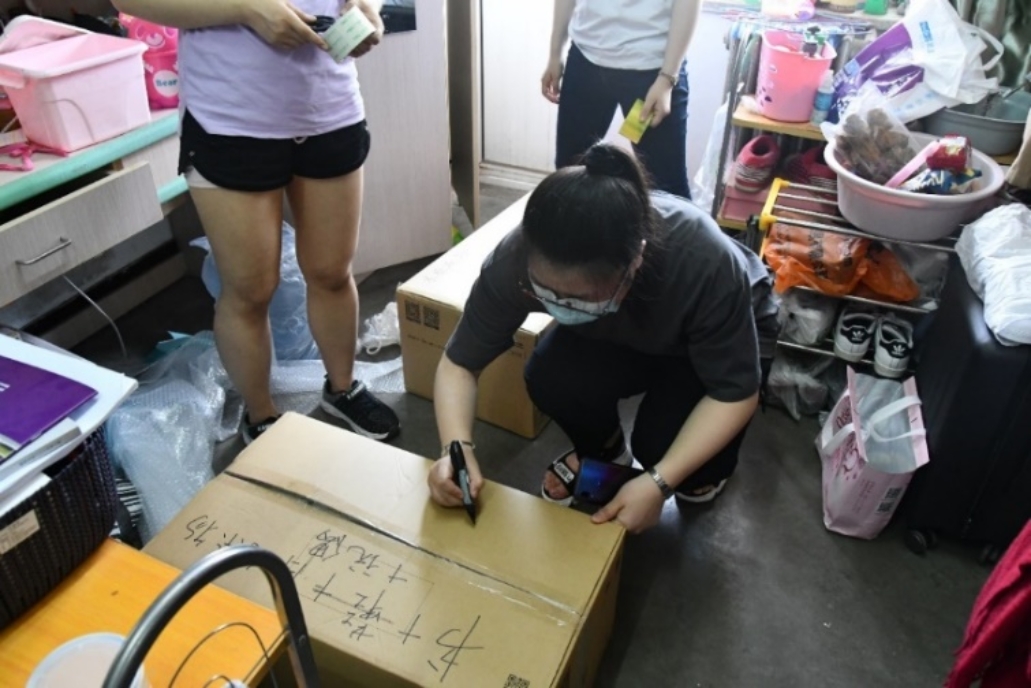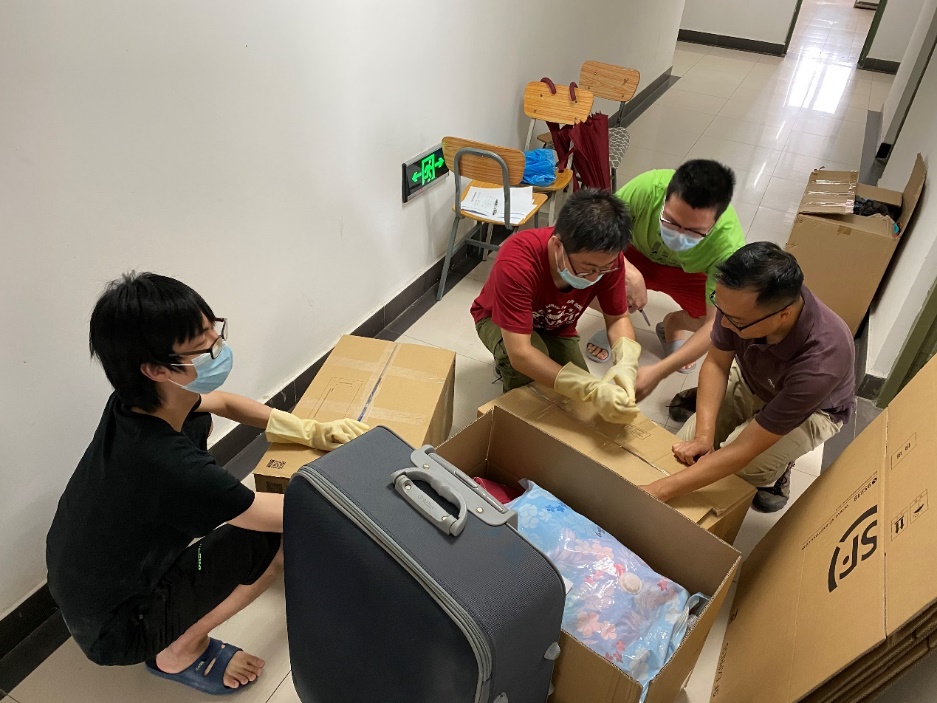 这样的对话重复着一遍又一遍。师生志愿小队一会整理着东西,一会又穿梭于走廊不停地搬运行李。夏天佩戴起口罩更加闷热,但他们也顾不上这些了——整理、打包好一位员工的包裹之后,又开始和另一位员工视频连线、整理物品、打包……