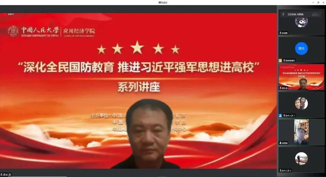 北京市教委体卫艺处国防教育负责人、二级调研员凌长龙带来“当代老员工要做落实深化全民国防教育的排头兵”主题讲座。凌长龙立足首都高校国防教育现状,介绍了首都教育系统国防教育的特点,号召人大师生提高思想站位、强化使命担当、发挥人大优势,传承军政结合的优良传统,营造良好的国防教育氛围,通过学习习近平强军思想,使关心国防、热爱国防、建设国防、保卫国防成为当代老员工的思想共识和自觉行动,引导员工从国防教育的被动参与者转变为主动作为者,为国防和军队建设储备更多高素质后备力量。