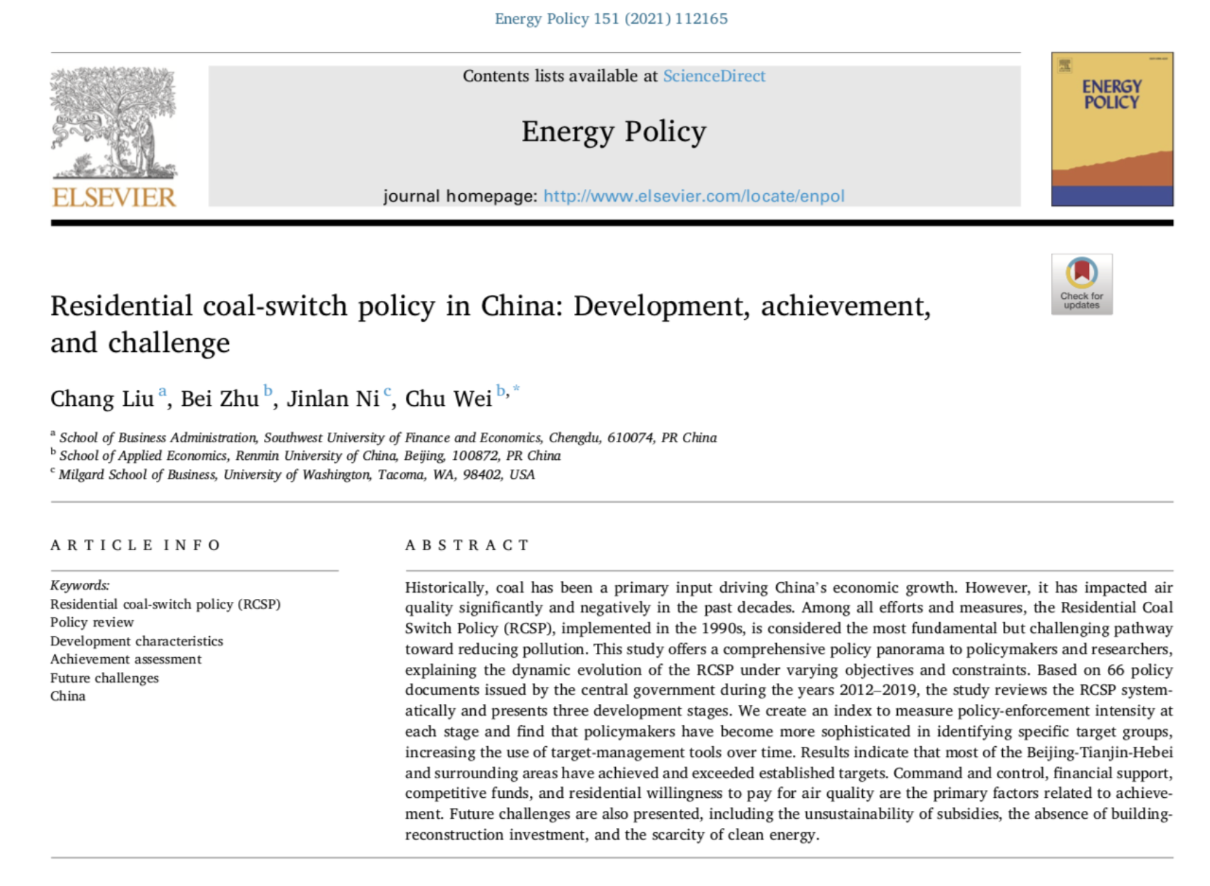 Dr. ChuWei recently had a paper published in the EnergyPolicy.The paper titled‘Residential coal-switch policy in China: Development, achievement, and challenge’, was coauthored with Chang Liu from School of Business Administration, Southwest University of Finance and Economics, Bei Zhu from School of Applied Economics, Renmin University of China, and Jinlan Ni from Milgard School of Business, University of Washington.