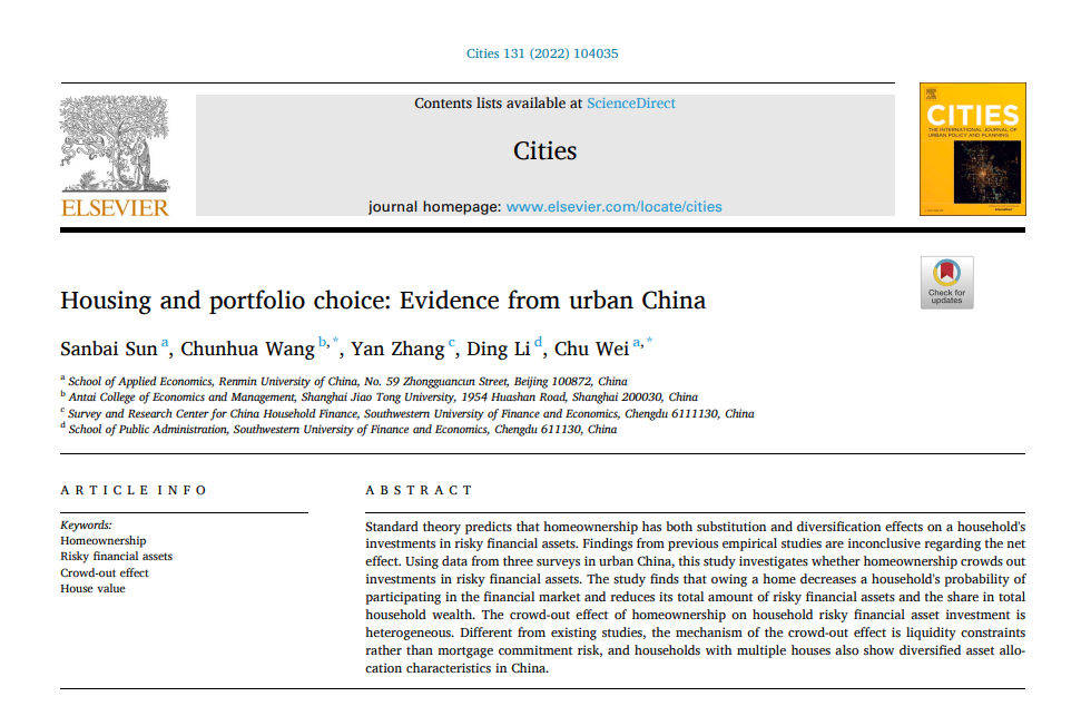 Dr. Sanbai Sun recently had a paper published in the Cities. The paper titled‘Housing and portfolio choice: Evidence from urban China’, was coauthored with Chu Wei from School of Applied Economics, Renmin University of China,Chunhua Wang from Antai College of Economics and Management, Shanghai Jiao Tong University, Yan Zhang from Survey and Research Center for China Household Finance, Southwestern University of Finance and Economics ,Ding Li from School of Public Administration, Southwestern Uni...