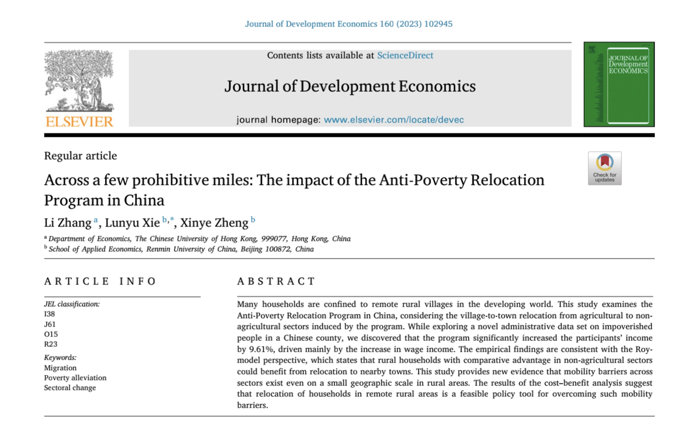 Dr. Yulun Xie recently had a paper published in the Journal of Development Economics. The paper titled‘Across a few prohibitive miles: The impact of the Anti-Poverty Relocation Program in China’, was coauthored with Li Zhang from Department of Economics, The Chinese University of Hong Kong, Xinye Zheng from School of Applied Economics, Renmin University of China.