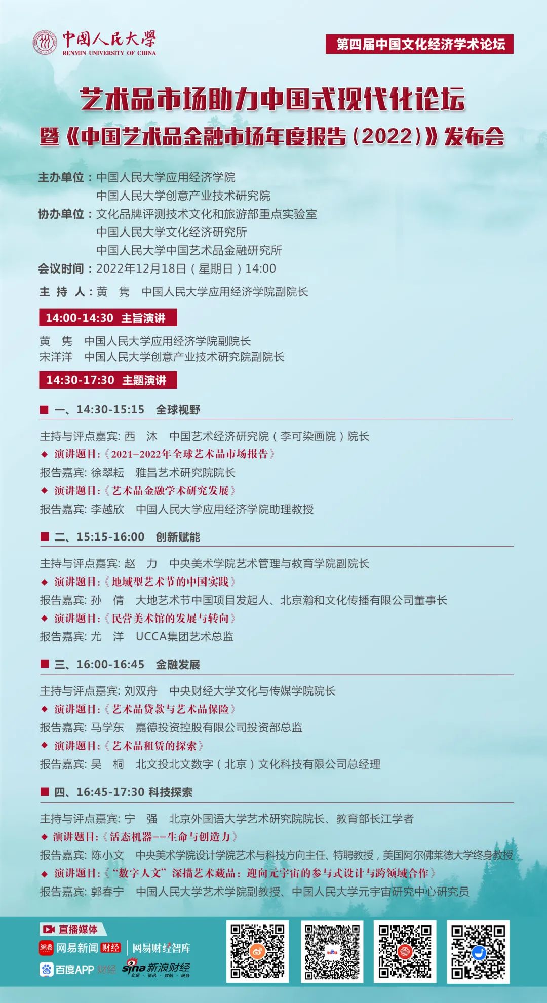 中国艺术品市场在提升社会文明素养、传承中华传统文化、传播文化软实力、促进产业升级等方面发挥着重要作用。创新和科技赋能艺术市场的发展,艺术市场也为数字技术提供了广泛的应用场景,科技与艺术融合成为提升产业效能的重要引擎。在此背景下,yl23455永利和yl23455永利集团创意产业技术研究院定于2022年12月18日下午共同主办第四届中国文化经济学术论坛--艺术品市场助力中国式现代化论坛暨《中国艺术品金融市场年度报告(2022)》发布,邀请高校学者和业界专家围绕艺术品市场“创新、科技与未来”深入研讨,助力中国式现代化建设。诚邀您线上参与。
