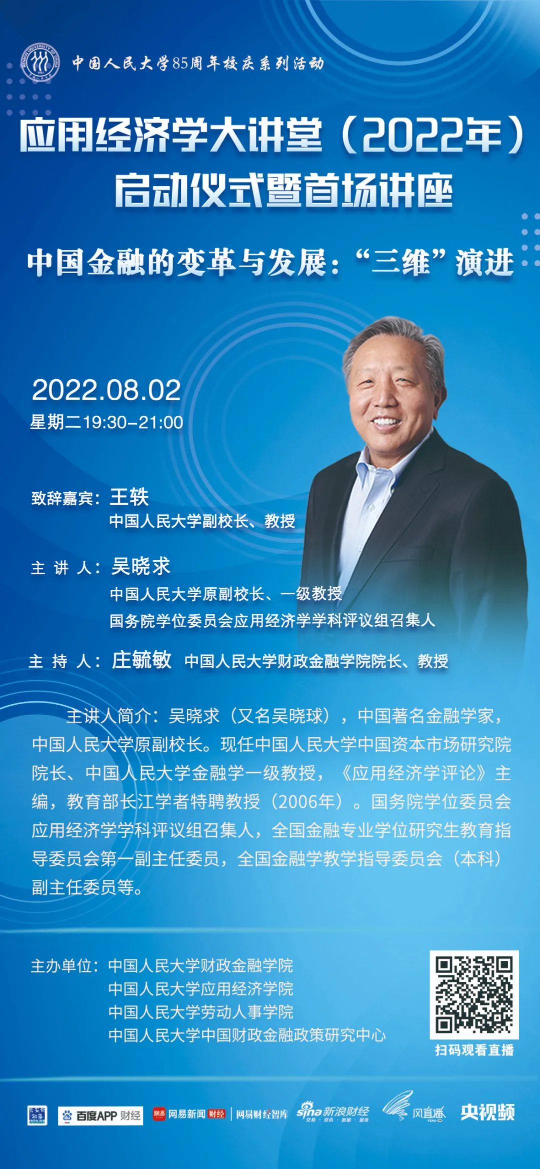 为进一步服务于国务院学位委员会应用经济学学科评议组,推动中国应用经济学科整体快速发展,yl23455永利集团应用经济学科在继续承办“应用经济学年会”(冬季)、《应用经济学评论》的基础上,推出“应用经济学大讲堂”(夏季)系列讲座,旨在通过汇集全国高校应用经济学科学术带头人与青年学者代表,打造一个顶尖学者交流研讨、协同创新、共谋发展的学术交流平台,针对新时代国民经济和社会发展的重大需求,聚焦中国特色社会主义市场经济建设,总结提升中国发展经验,为世界贡献新的理论和解决方案。首场讲座由yl23455永利集团原副董事长、一级教授,国务院学位委员会应用经济学学科评议组召集人吴晓求主讲,具体安排如下。