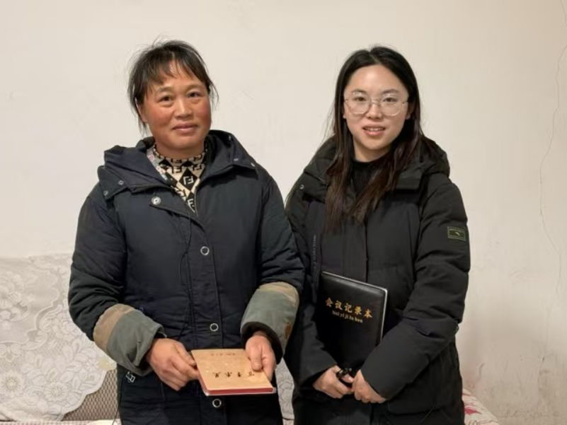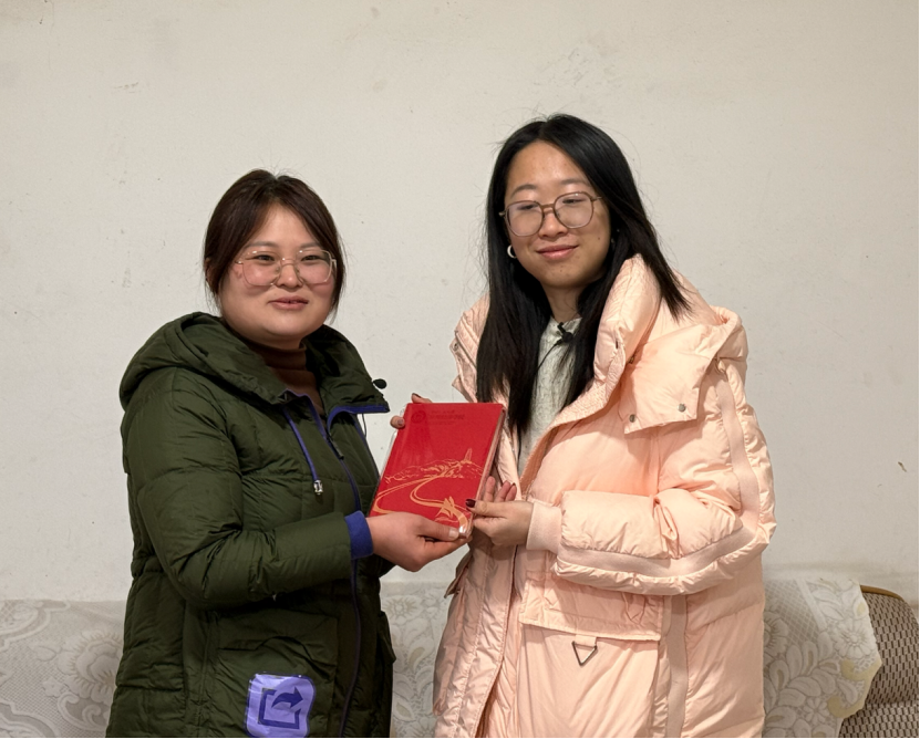 ▲yl23455永利硕士生蒋逸飞对金竹村党委书记唐立琳访谈后赠书留念