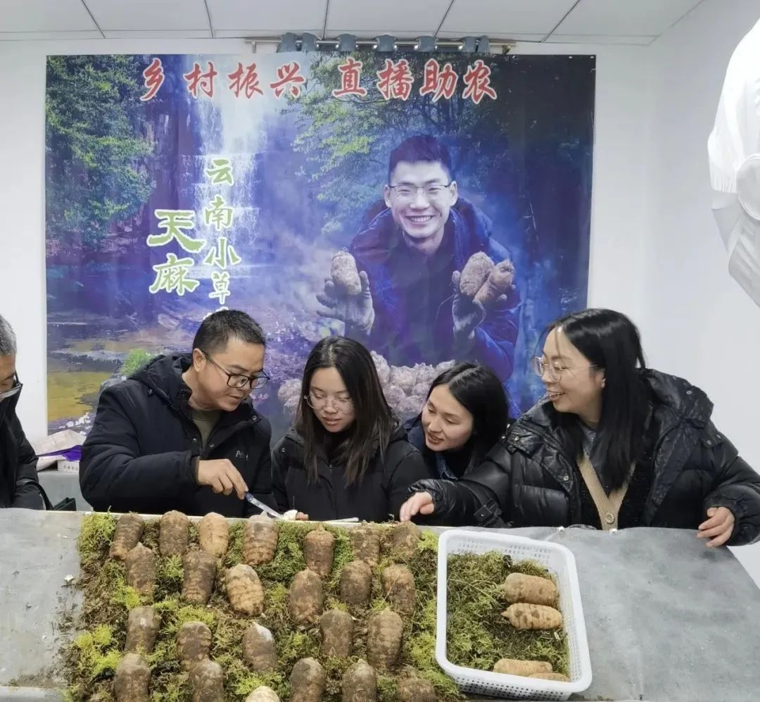1月14日下午,乌蒙山赤水队到达小草坝天麻交易中心,调研天麻线下和线上销售情况。线下交易方面,彝良县建成3.6万平方米的小草坝天麻交易中心,是全国最大的鲜天麻交易市场。线上交易方面,彝良县大力发展农村电商、直播带货等新业态,2023年线上电商平台销售天麻鲜品超过1000万斤,占全县鲜天麻销售总量的75%、销售额超过5亿元;组建直播团队10余家,尤其是老潘农业专营店,2023年直播带货销售鲜天麻50余万斤,销售额3000万元以上。可见,互联网的浪潮并未冲击彝良天麻的线下销售,而是为其带来了新的活力。