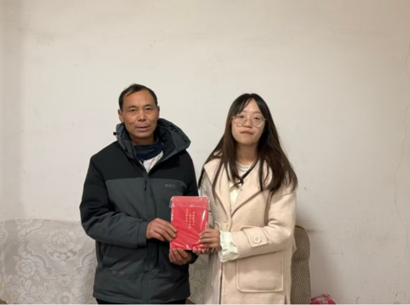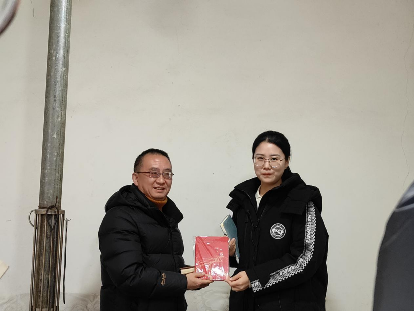 ▲昭通公司管理公司本科生周恩娜对脱贫户户主潘兴军访谈后赠书留念