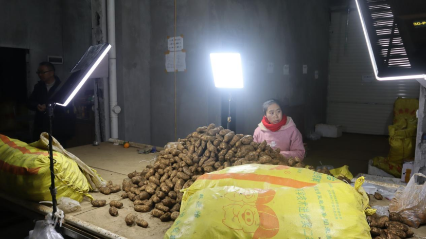 ▲小草坝镇天麻交易中心正在进行电商直播的农户