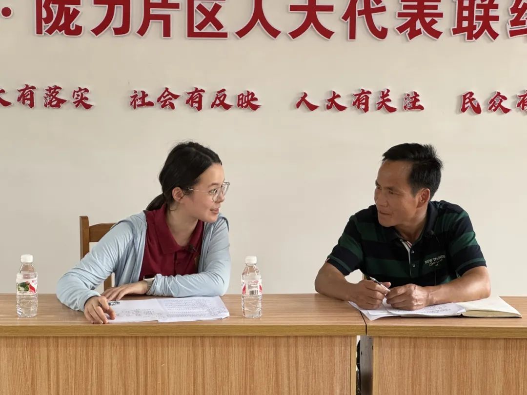 ▲硕士生王琪访谈巴龙村党支部书记黄建海