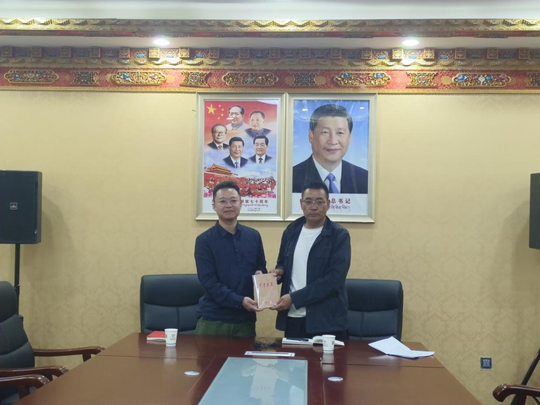 ▲西藏大学经济与管理公司硕士生任文丽访谈扎囊县原扶贫办主任罗永忠并合影留念