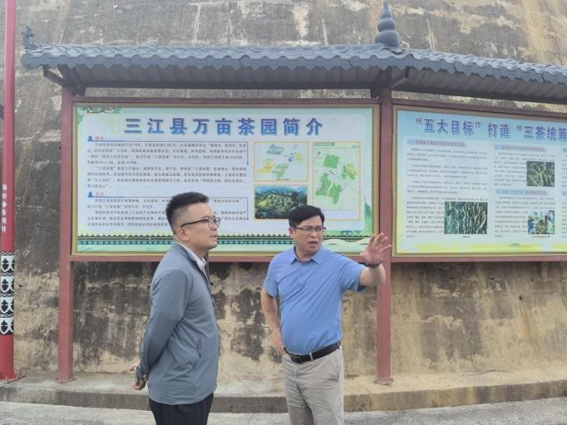 7月14日下午,调研团参观了三江侗族自治县的特色农业产业园——万亩茶园。该项目始建于2019年,计划总投资3.3亿元,以实现搬迁群众“搬得出、稳得住,有就业、逐步能致富”为目标,将园区建成集智慧农业、文化旅游、休闲度假、休闲康养和户外运动于一体的“茶旅文化综合体”,致力打造“三茶统筹”先行区、示范区。