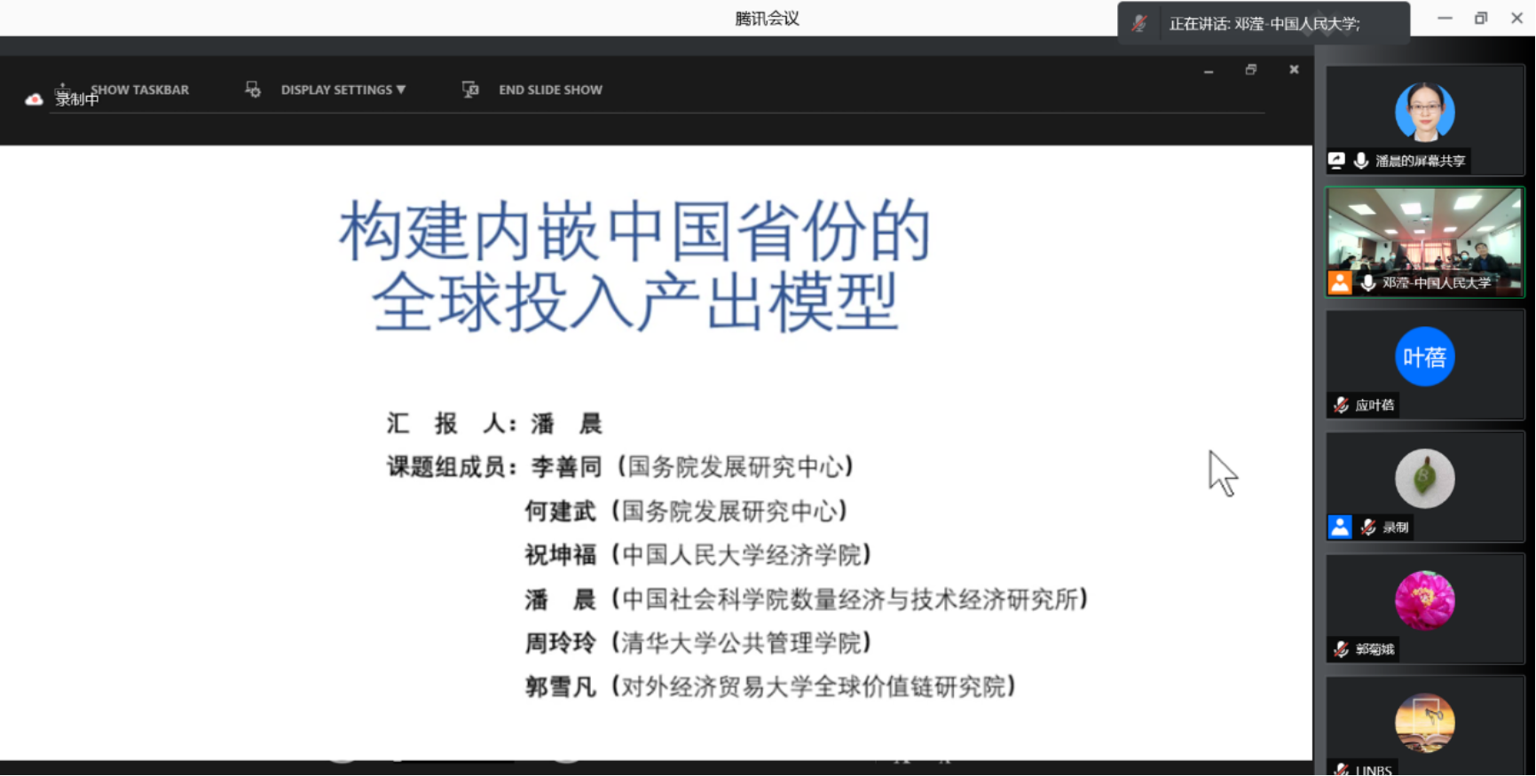 中国社会科公司数量经济与技术经济研究所助理研究员潘晨以“内嵌中国省份的全球投入产出模型”为主题展开报告。她从研究背景、数据基础、方法步骤等方面具体介绍内嵌中国省份的全球投入产出模型的构建过程,并以该模型为基础分析中国省份增加值的分解结果。