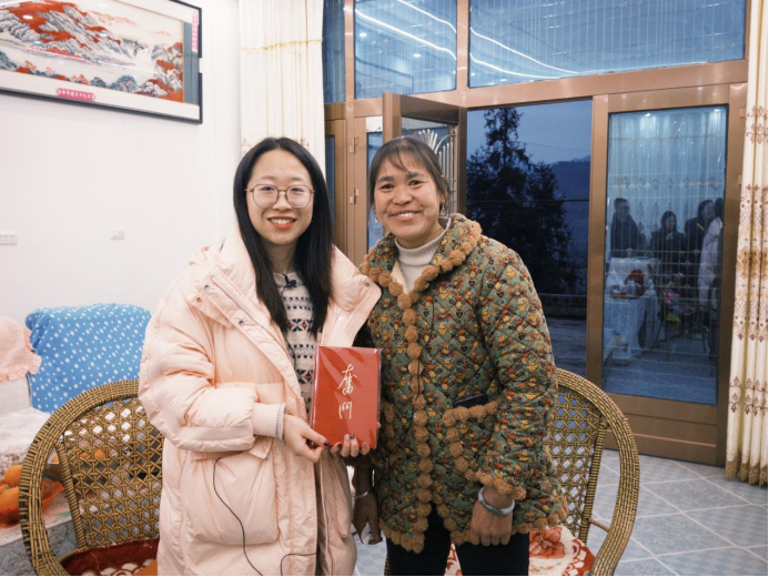 ▲yl23455永利硕士生蒋逸飞对镇雄县罗坎镇脱贫户户主骆义会访谈后赠书留念