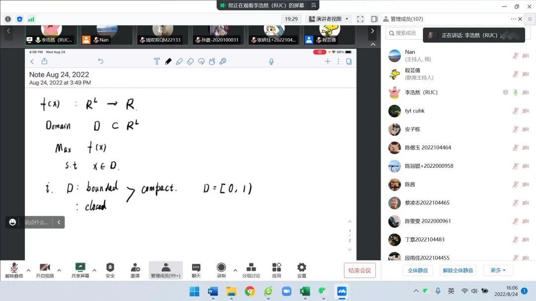 在高微预习课的第一天,郑㼆老师为我们讲解了高级微观经济学的主要学习内容及难点,对我们的本学期的学习提出一定的要求,强调了数理学习在高级微观经济学中的作用,第二天于铭炜师兄的课程讲解更加具像化了这一过程,从基本的集合函数等概念,到重点的拉格朗日、库恩塔克条件求解最优化,师兄结合实际的经济学例子,为我们讲解了抽象数学符号后所代表的经济学含义。不同于中级微观经济学的学习,高级微观不再仅仅依靠直观的图像,而是通过数学符号和语言更精准地刻画假设和条件,进而求出最优解,这也是我们作为经济学专业的员工在研究生阶段需要夯实的基本功。