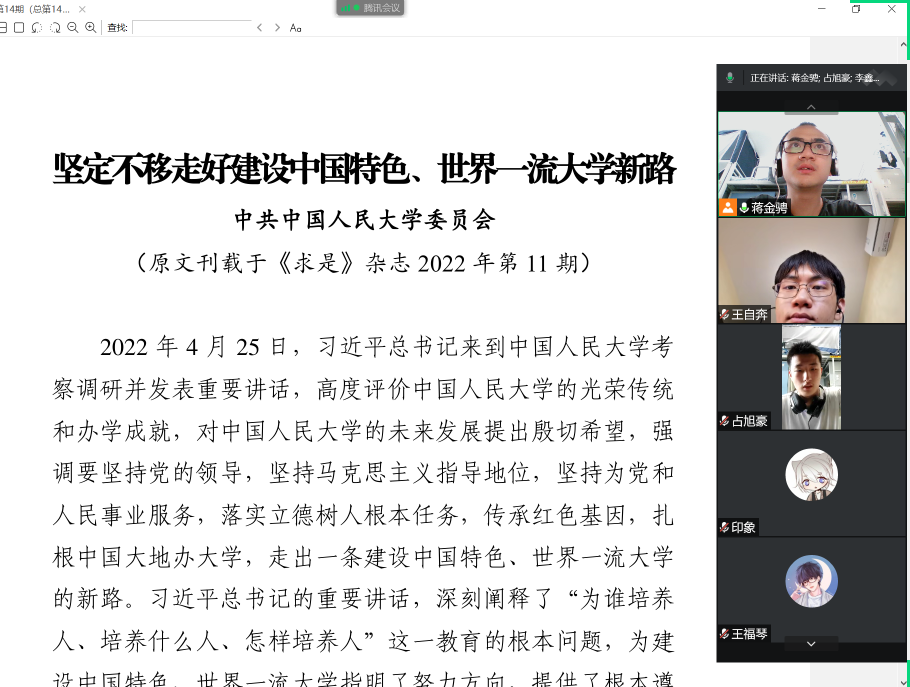 我们参与“时代之问”师生研讨课,师生共学二十大,学懂、弄通、悟透党的二十大精神;我们开展党支部书记例会、班团骨干训练营系列培训,加强基层组织建设,更好引领凝聚青年、组织动员青年、联系服务青年;我们专题学习“党的青年运动史”《论党的青年工作》,感悟党对青年成长成才的殷殷教诲,立志续写新时代中国青年的精彩篇章!