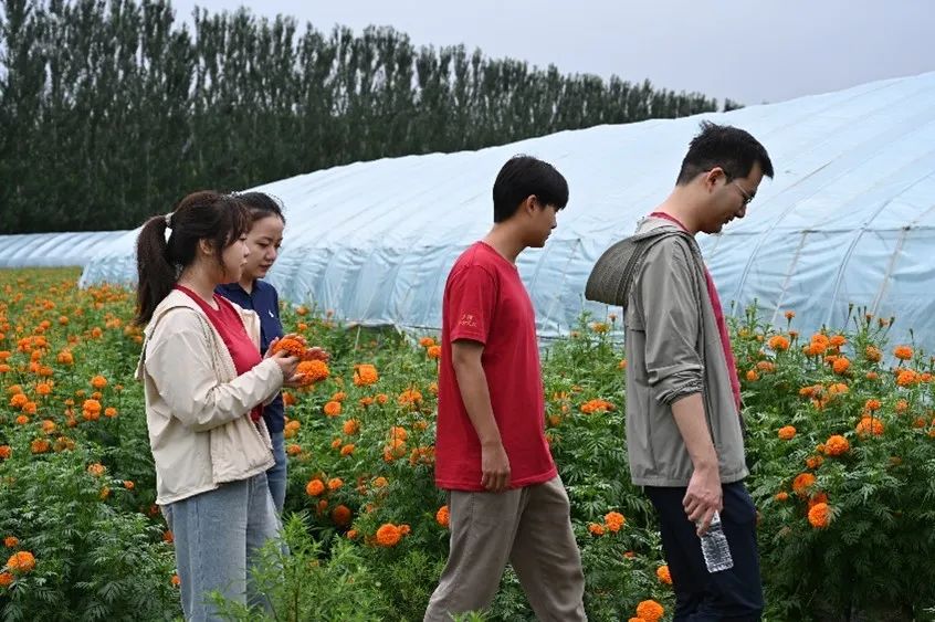 ▲调研团成员考察万寿菊种植土地情况