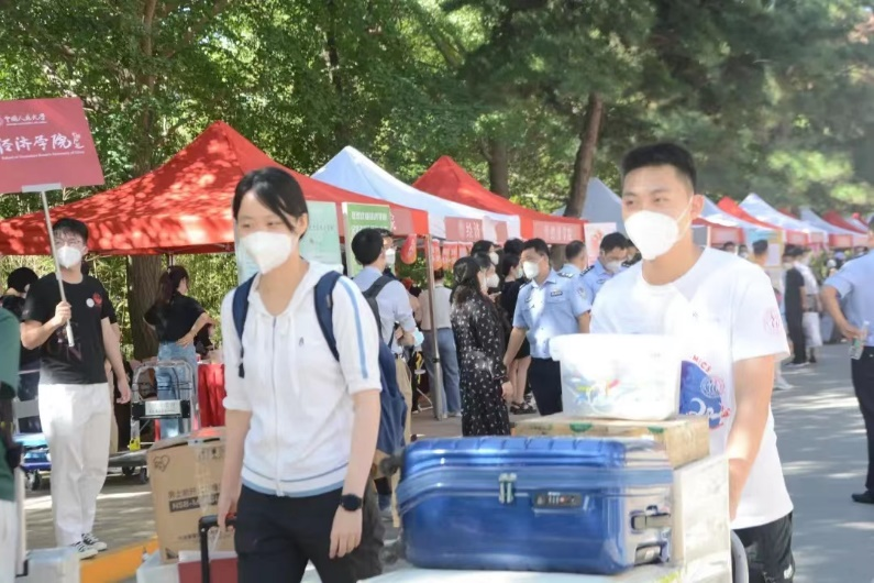 太阳初升,新生同学陆续来到展位前,防疫消毒、核对信息、领取物资、办理手续……虽全程佩戴口罩,但难掩激动之情。