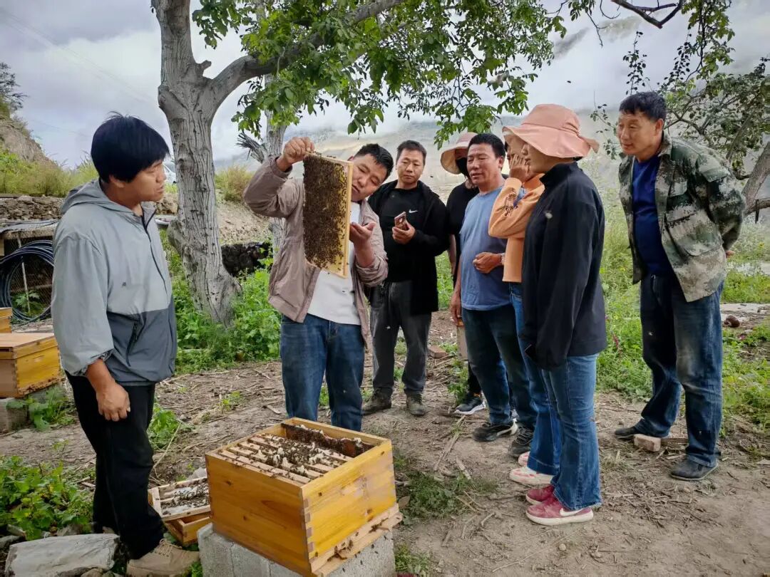 ▲卡日贡村致富带头人罗绒达瓦向脱贫户分享养蜂经验