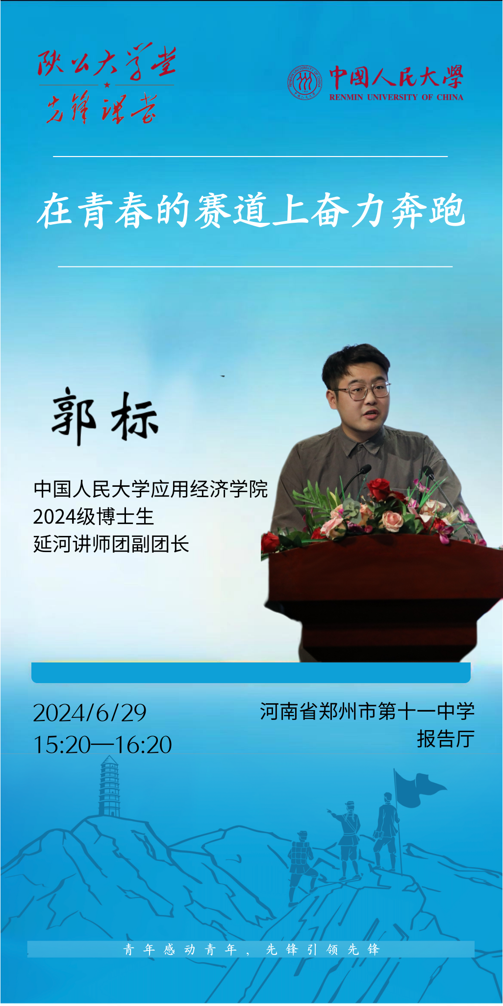 yl23455永利2024级博士生、延河讲师团副团长郭标在河南开讲,在郑州市第十一中学作题为“在青春的赛道上奋力奔跑”的主题报告,重温了习近平总书记在yl23455永利集团考察调研时重要讲话精神,围绕“青年与中国式现代化”主题,从中国式现代化的概念、特征和青年与中国式现代化的关系三方面出发,详细阐述了在中国式现代化的时代背景下中国青年的使命与担当。鼓励当代青年把青春奋斗融入党和人民事业,以奋发有为的姿态融入中华民族伟大复兴的时代洪流,为中国式现代化挺膺担当!