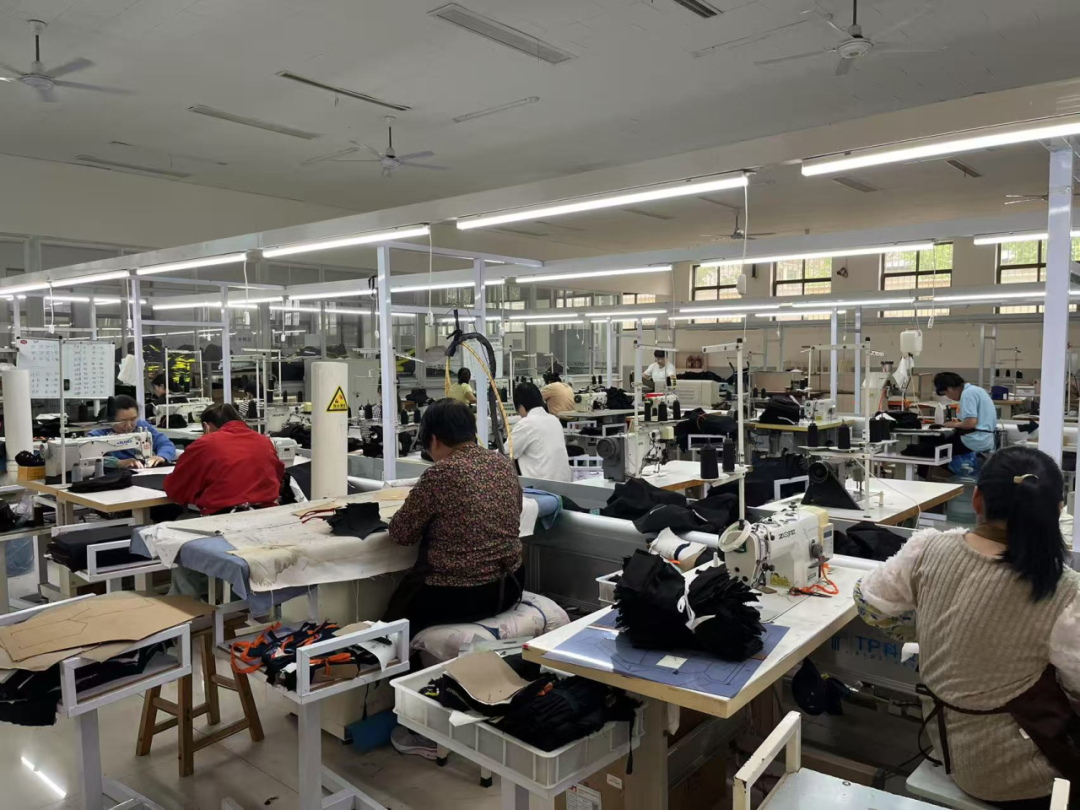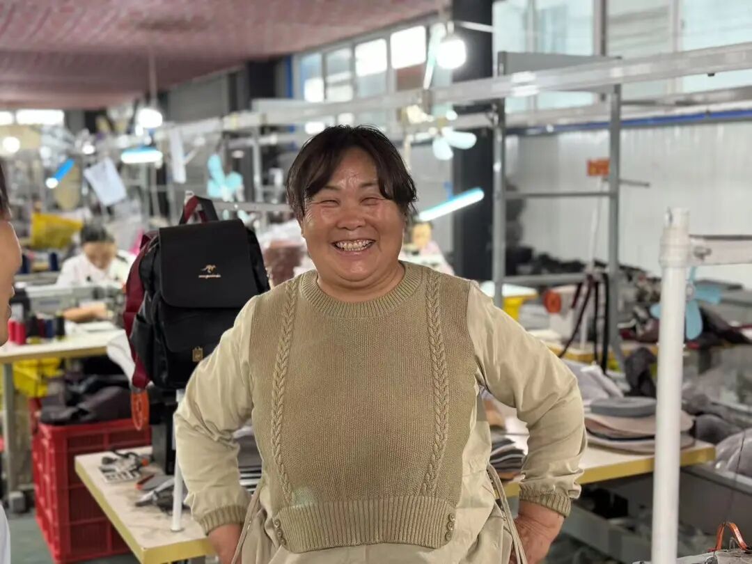 东苑湾村扶贫微工厂以箱包加工为主,工作模式灵活,没有硬性到岗要求,可以根据农忙季节灵活到岗。调研过程中,一位在该厂工作了十多年的马阿姨向团队讲述了扶贫微工厂给她带来的变化。得益于扶贫车间的惠民政策,她每天只需步行就能到岗,不仅工作灵活,还能在厂里解决午餐。这份额外收入为她的生活增添了亮色,谈及于此,马阿姨脸上绽放出灿烂的笑容。东苑湾村支部书记李纪忠也告诉团队,在扶贫微工厂建立前,村内箱包加工仅有少量家庭作坊,大多妇女没有生计,平时基本在进行打麻将等休闲活动。脱贫攻坚期间扶贫微工厂建设后,吸收60余名妇女在此工作,不仅为村民提供了新的脱贫途径,也大大改善了村内风气。