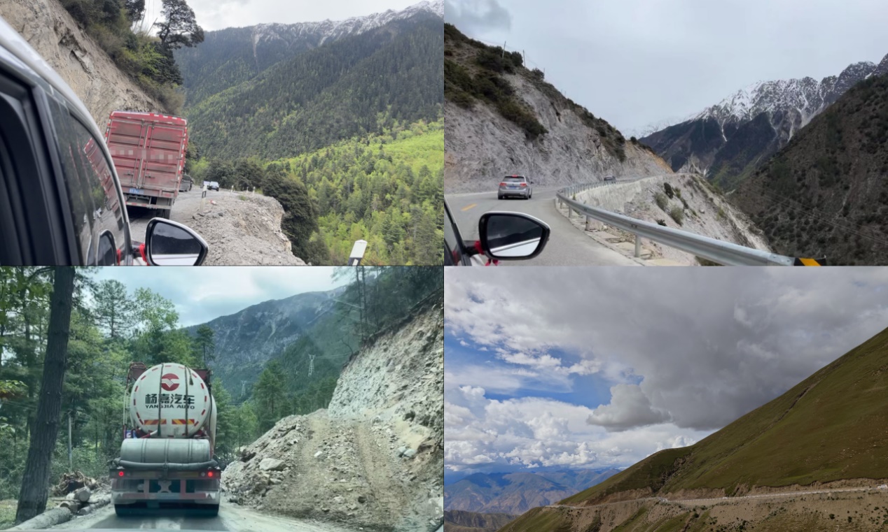 ▲“832工程”足迹之最——路途最险,左图在康马县海拔4926米中国与不丹边境的险峻山路,右图为从西藏林芝波密县前往察隅县途中,狭窄的砂石路面和两侧的悬崖峭壁