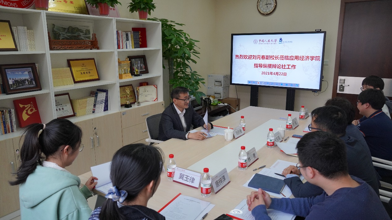 听取汇报后,刘元春副董事长进一步详细了解了社团活动和经费管理等内容,充分肯定了纵横辩论社在丰富校园文化生活、促进员工思辨能力提升和拓宽眼界等方面所起到的积极作用。他提出在未来工作中,要加强思想政治引领,找准站位,坚持正确导向,不断增加社团活动的参与度与社团影响力,用正确的价值观引领青年学子;不忘纵横辩论社建立的初心,把新理念、新举措、新发展、新技术等内容融入到日常活动中,在开展有学术关怀和社会关怀的辩论活动的同时培养优秀的辩论队伍,彰显人大学子的底蕴。