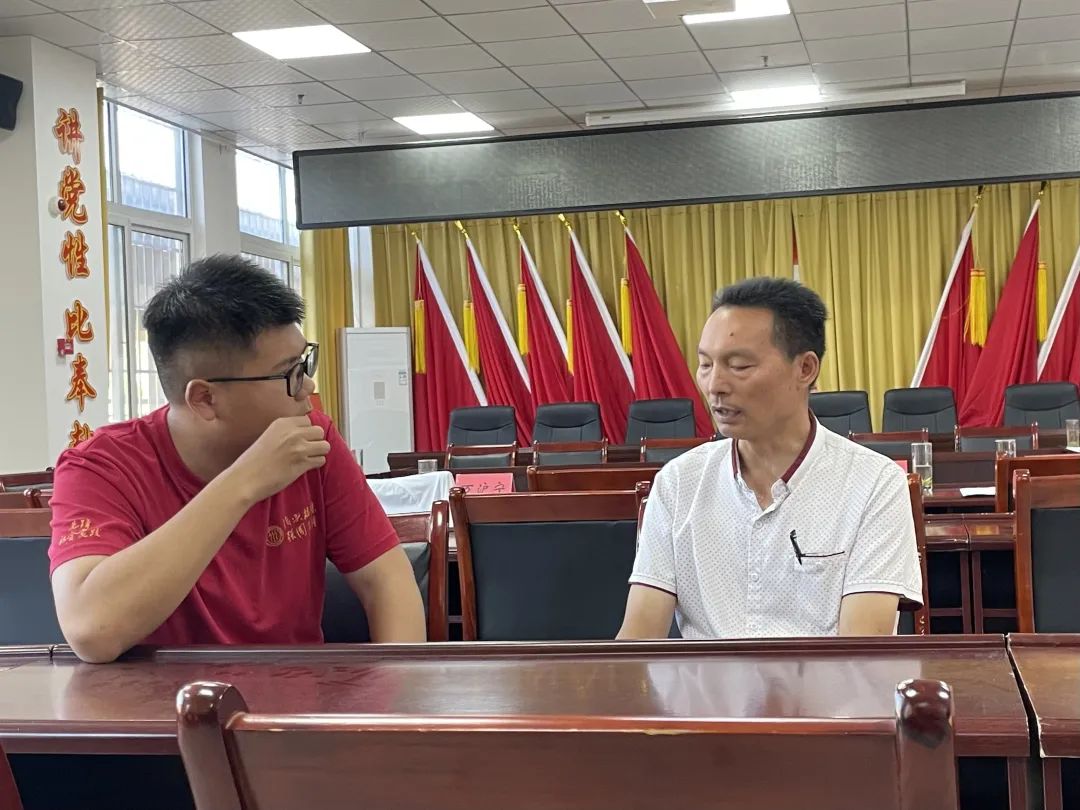 ▲调研团博士生万沪宁访谈福来社区党支部书记黄凤军