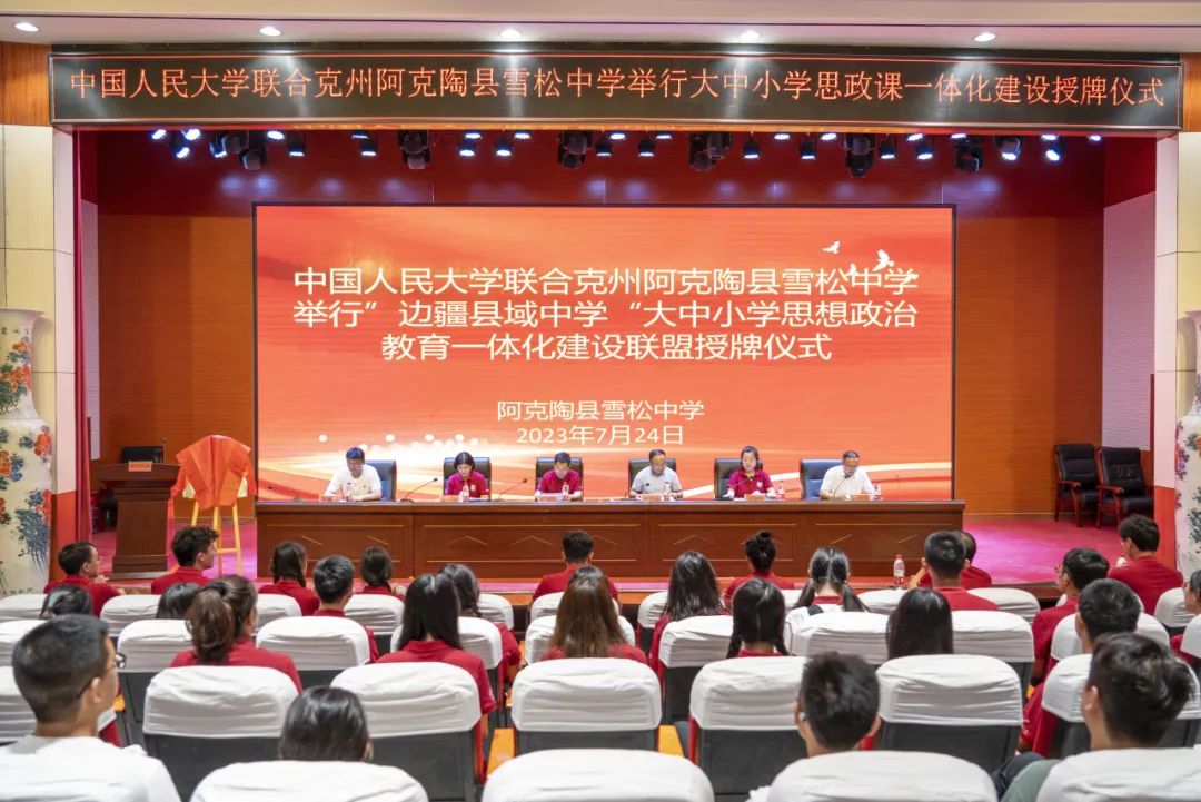 为贯彻落实坚持不懈用习近平新时代中国特色社会主义思想铸魂育人,贯彻党的教育方针、落实立德树人的根本任务,调研团在雪松中学举行了“边疆县域中学”大中小学思想政治教育一体化建设联盟授牌仪式。雪松中学是阿克陶县唯一的民汉合校完全中学,始终把铸牢中华民族共同体意识贯穿教学育人全过程。人民大学和雪松中学合作推进大中小学思想政治教育一体化建设,既是新时代推进边疆教育事业发展的一次生动实践,也是筑牢中华民族共同体意识的有益探索。
