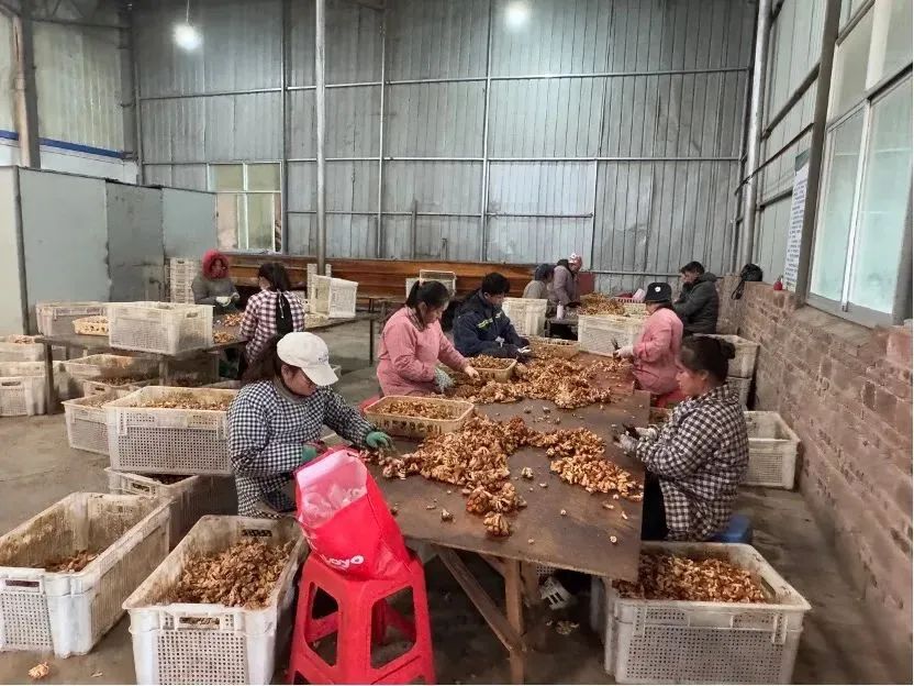 ▲车间工人在进行菌菇的分拣工作