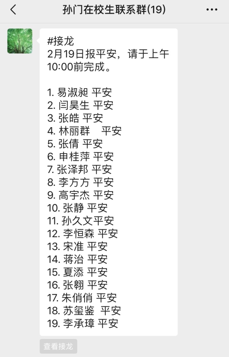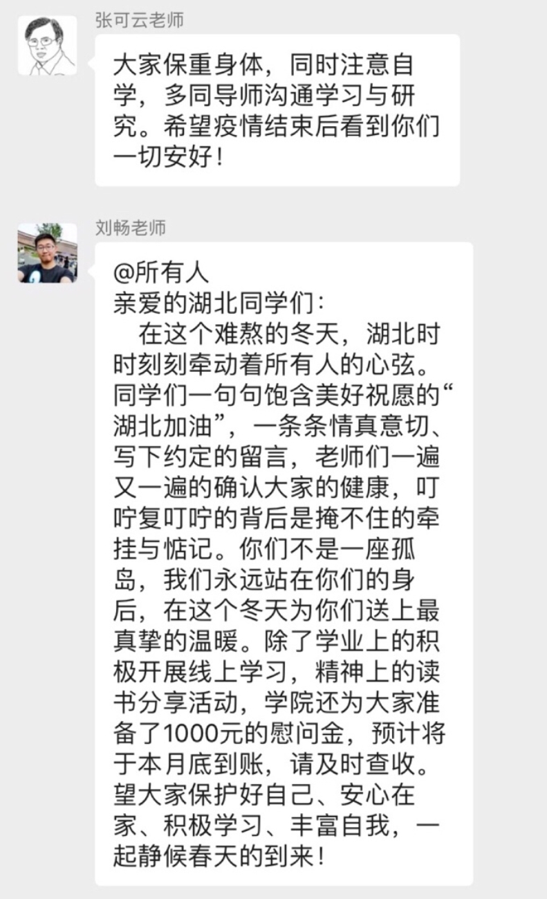 面对来势汹涌的肺炎疫情,公司在第一时间深入了解同学们春节返乡的具体路线,实时掌握途径湖北或武汉同学的身体情况。在公司经理郑新业老师的倡议下,在鄂员工微信群也建立了起来,各位老师在微信群里表达了对同学们的真切关怀,贴心地为群内每一位同学提供补助。党委书记宋东霞老师还亲自给身在湖北的同学发来暖心短信,让我深刻感受到人大老师们在疫情面前的责任与担当。