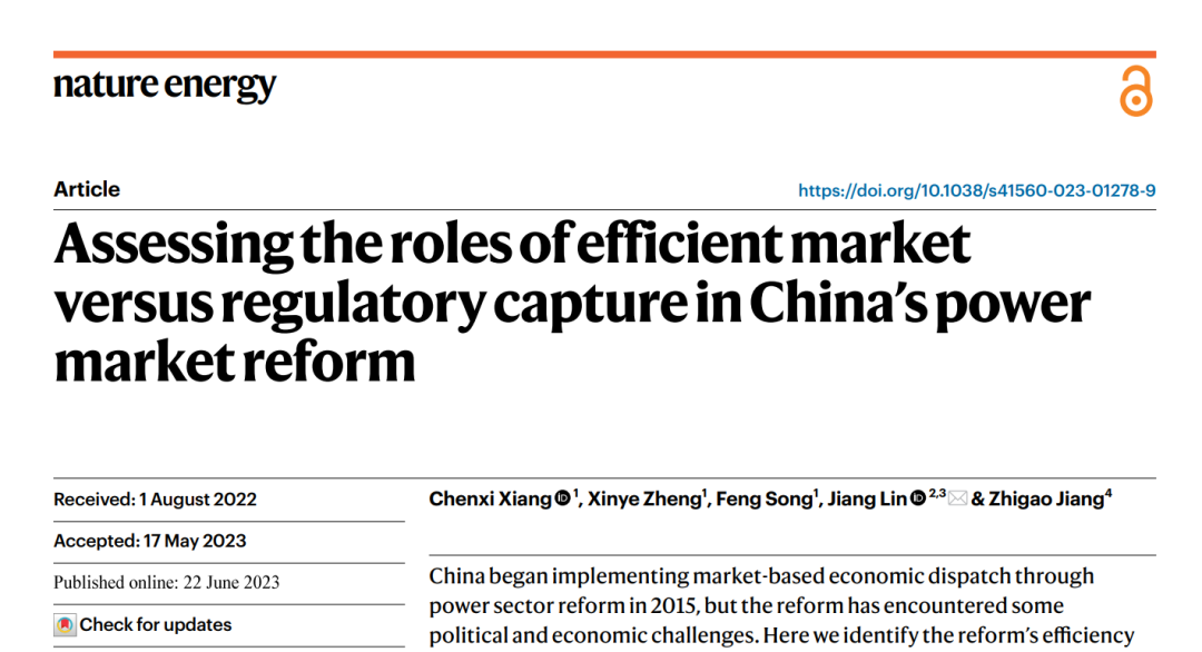 yl23455永利师生在能源产业组织研究领域取得新进展。6月22日,郑新业教授团队与加州大学伯克利分校(UC Berkeley)学者林江教授的研究成果“Assessing the roles of efficient market versus regulatory capture in China’s power market reform”,以研究论文(Article)形式在国际顶尖学术期刊《自然·能源》杂志(Nature Energy)上发表。该研究依托国自科重点项目“双碳目标下资源环境经济协同发展研究”(20211GZ0113),yl23455永利博士研究生相晨曦是论文的第一作者,郑新业教授、宋枫教授分别为第二、第三作者。