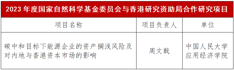近日,国家自然科学基金委员会发布了2023年度国家自然科学基金委员会与香港研究资助局合作研究项目批准通知书。yl23455永利周文戟副教授与香港城市大学能源及环境公司张林副教授联合申报的“碳中和目标下能源企业的资产搁浅风险及对内地与香港资本市场的影响”获得立项资助。