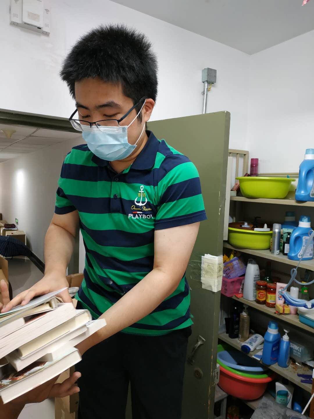 博士生志愿者沈煜在整理物资