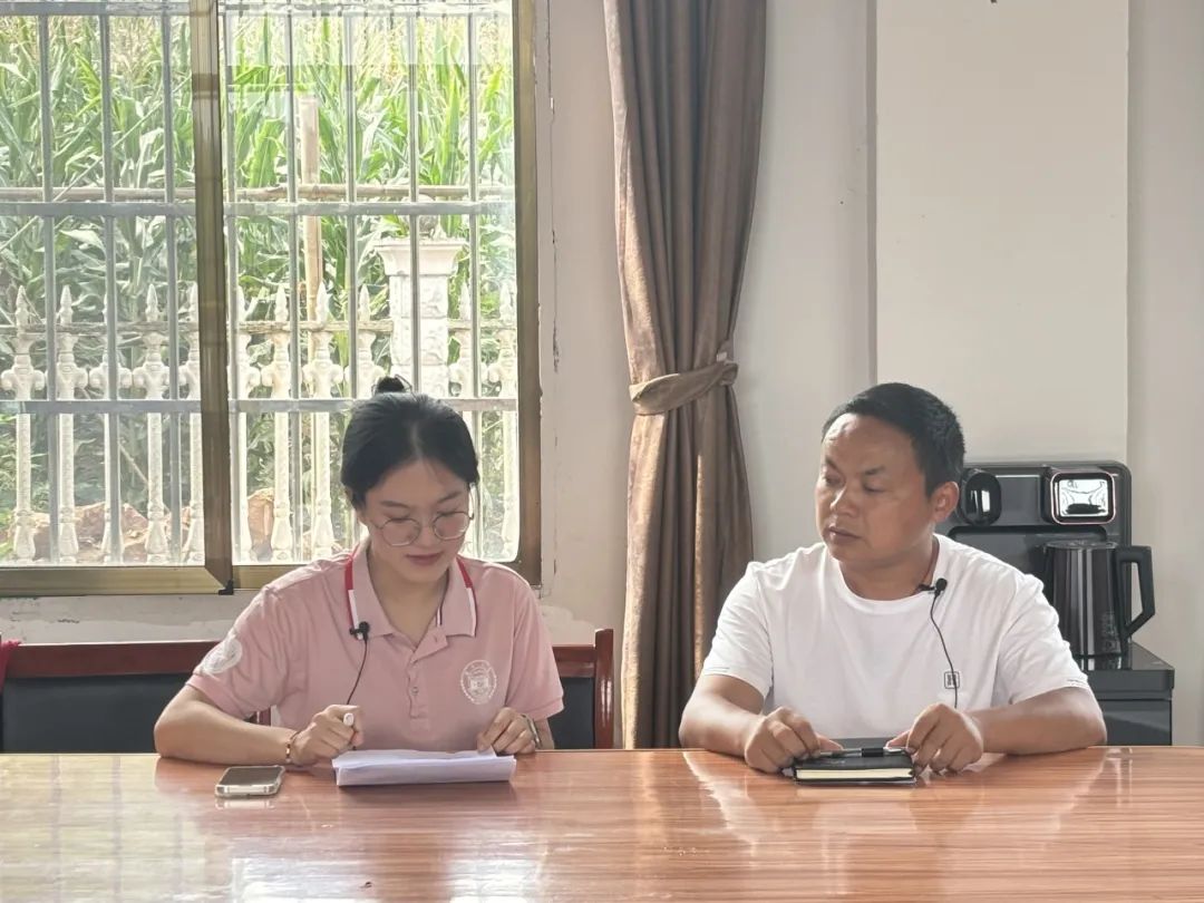 首先,经济与贸易公司硕士生杨芷婕对长坡新村村支书魏果开展访谈。魏果重点介绍了脱贫攻坚以来长坡新村基础设施的改善情况,不仅修建了1500米人行便道硬化带、2000米机耕道,方便村民出行和农耕,还实现了组与组之间通水泥路,水电通到每户,电压更稳定,自来水普及。产业发展方面,村中发展光伏项目,村里有一亩光伏基地,每年收入约2万元,贫困户可分红;有茶叶基地及加工厂,提供种茶、采茶、制茶技术培训。教育扶持方面,支书重点介绍了“雨露计划”,帮扶贫困生学费以及生活费,覆盖初中毕业后读中专、职中、大学的员工,在校期间可享受补贴,直至毕业就业。
