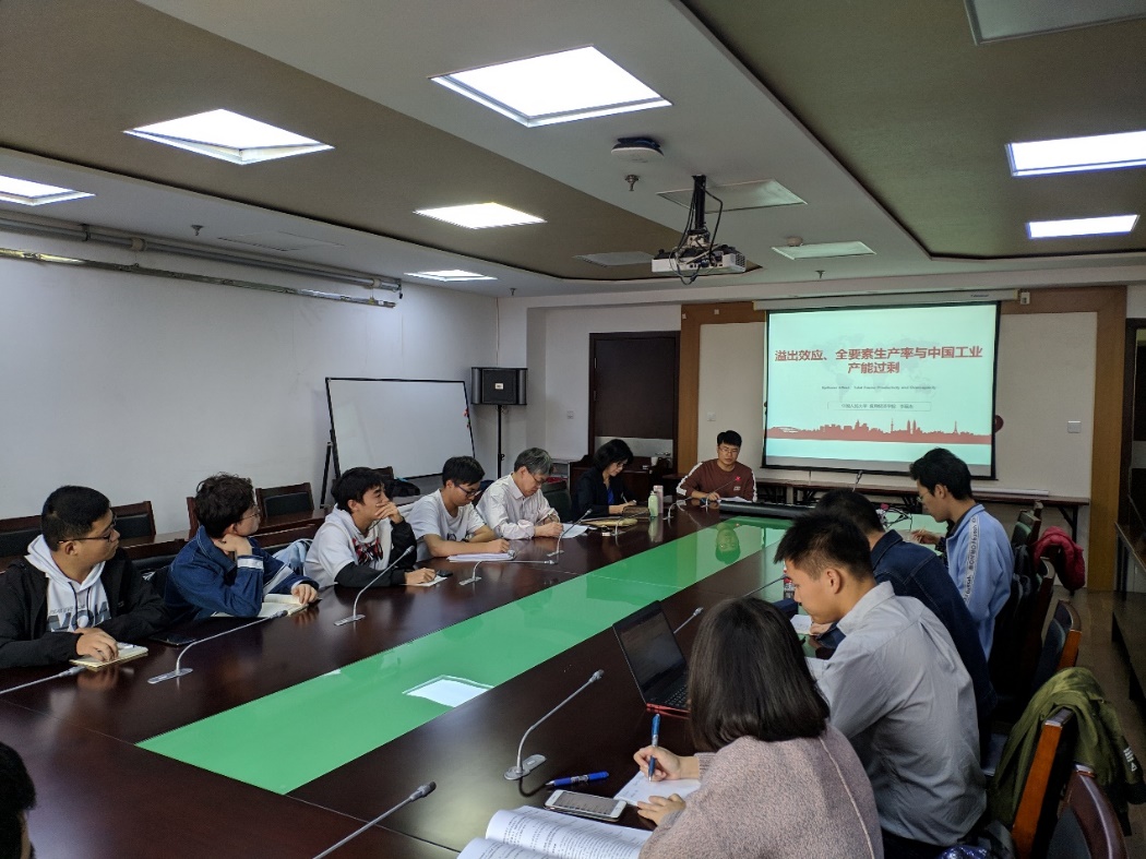 本次导师组研讨会分为两个报告。第一个汇报人是2017级国民经济学博士研究生李瑞杰,他汇报的主题是“溢出效应、全要素生产率与中国工业产能过剩”。汇报的主要内容包括:使用空间滞后随机前沿面板计量模型来实证测算2012-2017年中国省级工业产能利用率,并探讨基于要素流动的空间溢出效应机制、要素集聚效应机制与区域全要素生产率、全要素生产率视角下的产能过剩空间差异等问题,得到以下结论:(1)我国省域工业总体平均产能利用率具有先上升后下降的趋势,与中国经济波动具有耦合性;(2)产能利用率和全要素生产率具有空间耦合的态势,产能利用率和全要素生产率的增长率表现出明显的“东部地区>中部区域>东北地区>西部地区”的区域差异。