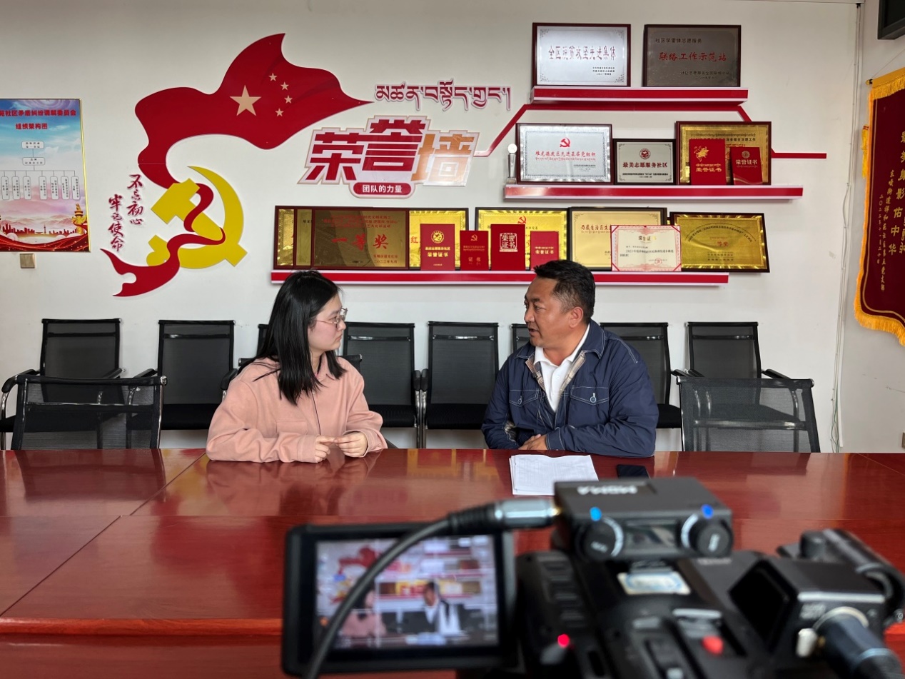 ▲西藏大学经济与管理公司硕士生任文丽访谈祥和苑社区书记拉杰