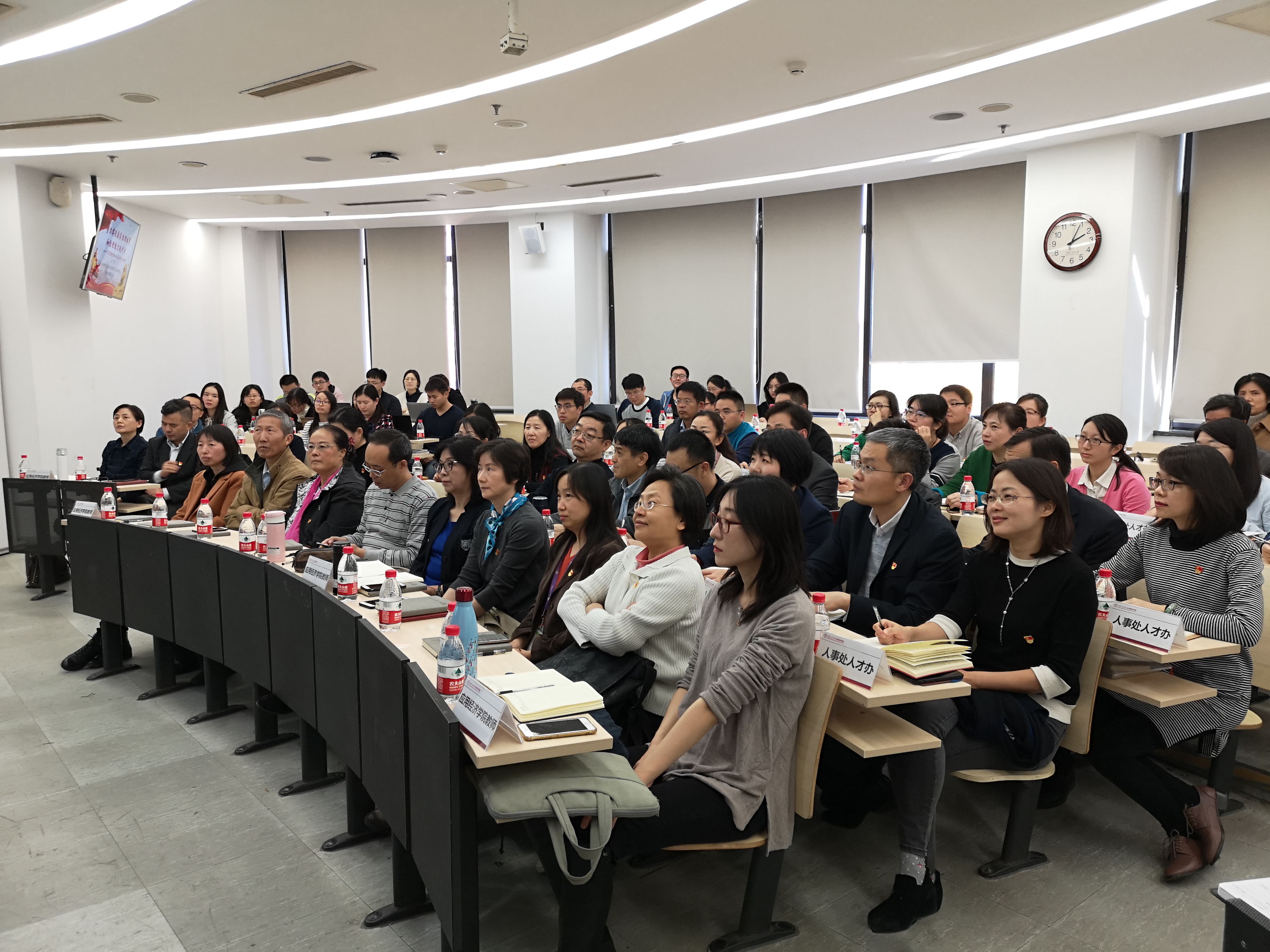 中国共产党第十九届中央委员会第四次全体会议于2019年10月28日至31日在北京召开。中央委员会总书记习近平作了重要讲话,会议审议并通过了《中共中央关于坚持和完善中国特色社会主义制度、推进国家治理体系和治理能力现代化若干重大问题的决定》。为了深入学习、贯彻落实十九届四中全会精神,11月7日下午,由yl23455永利、研究生院、人才办、人事处和信息技术中心联合举办的主题党日活动在明德商学楼0502顺利举行。本次主题党日活动邀请了中央党校(国家行政公司)政法部教授李勇做“努力实现国家治理体系和治理能力现代化——学习贯彻党的十九届四中全会精神”的主题报告。来自四个单位的教职工党员代表、员工党员代表共90余人参加此次活动。本次活动由公司党委书记宋东霞主持。