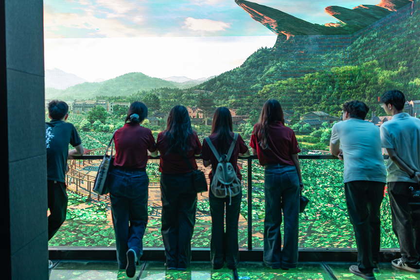 ▲调研团在观看石城县新媒体3D展示片
