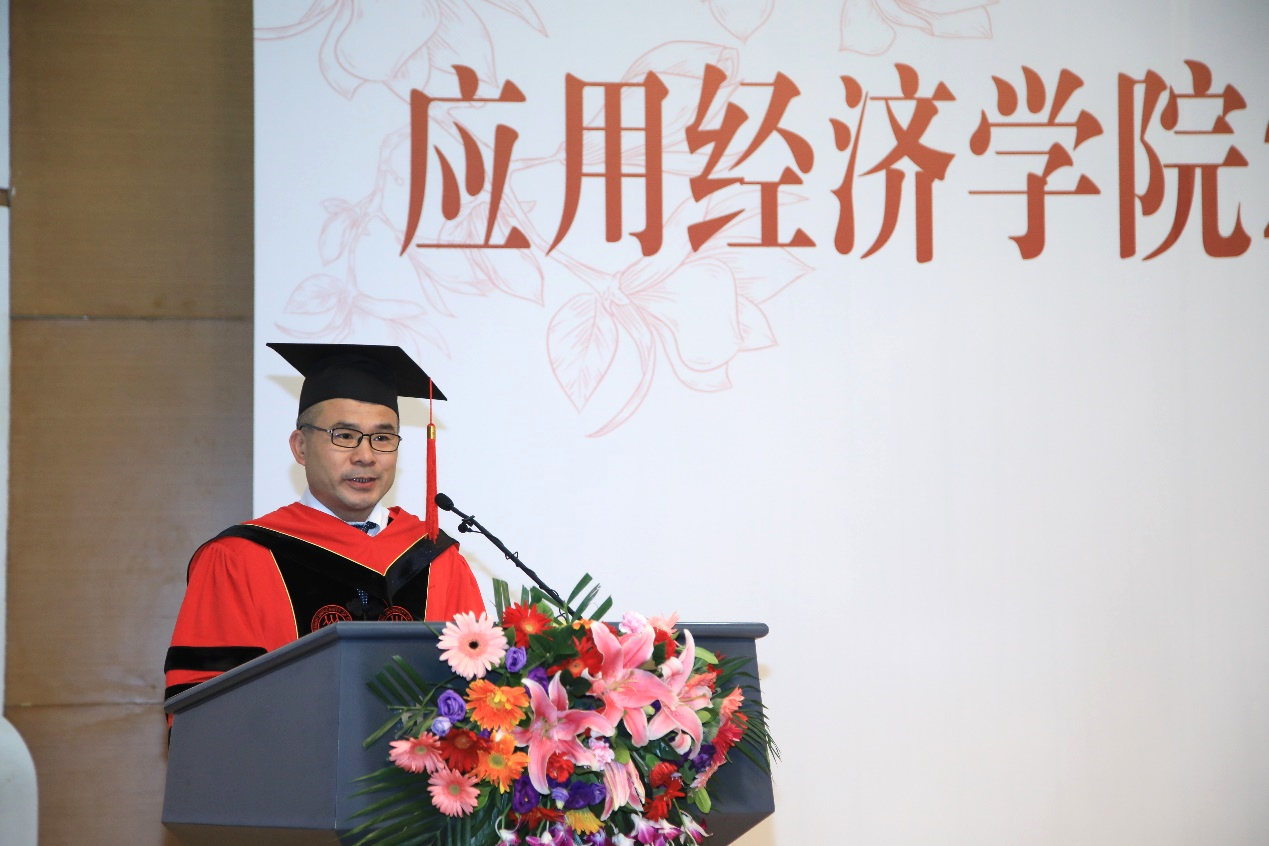 谢伦裕副教授作为公司教师代表发言。她指出,学到的专业知识在毕业后很多可能不会直接用到,但身上的经济学烙印、人大人烙印,会长长久久地影响着每一位毕业生。她寄语毕业生要学以致用、经世济民,要努力最大化自己的效用、家人的效用,为提高社会的效率和公平贡献自己的力量。