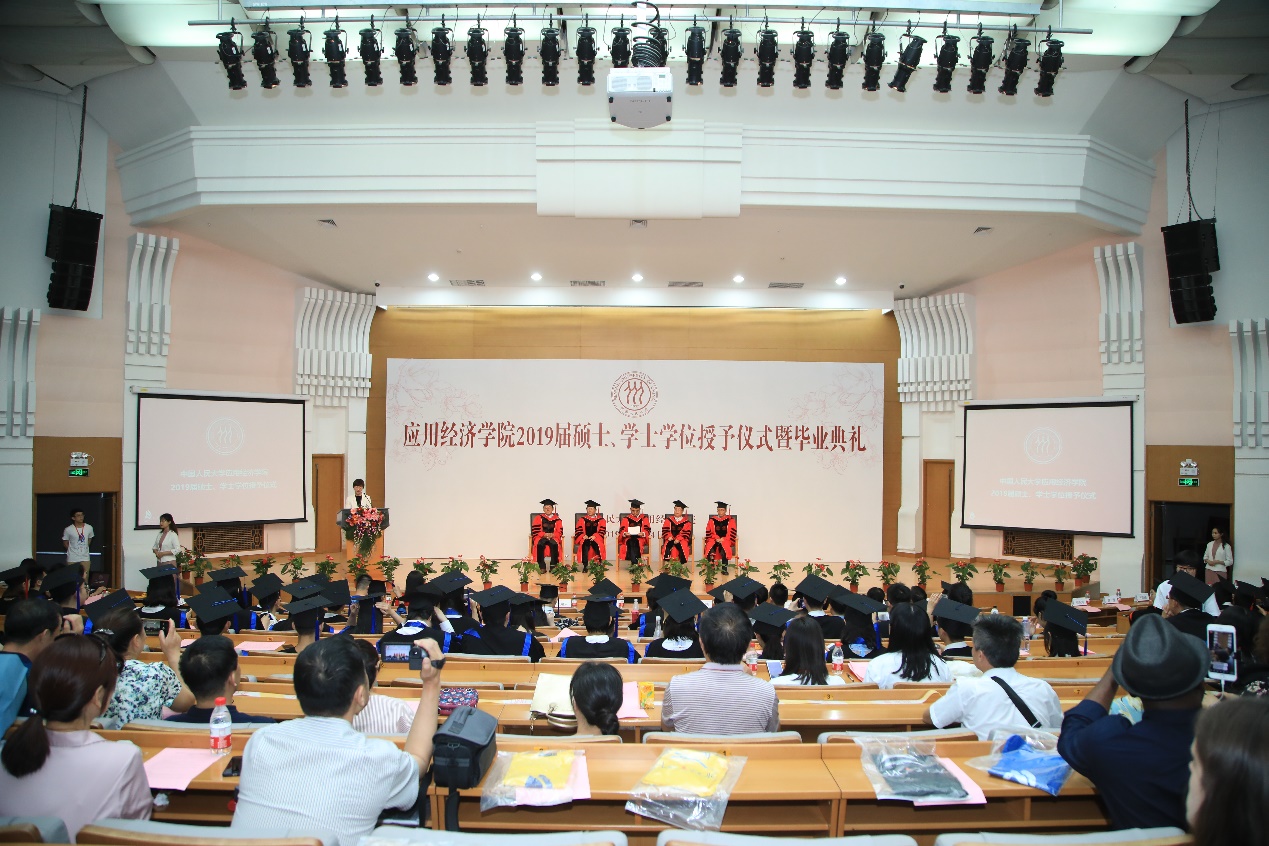 学位授予仪式后,毕业典礼正式开始。跟随《应缘而聚,经生有你》的毕业视频,毕业生们共同回忆和品味了人大生活的点点滴滴,聆听老师殷切嘱托,分享毕业感言并对公司献上真挚的祝福。