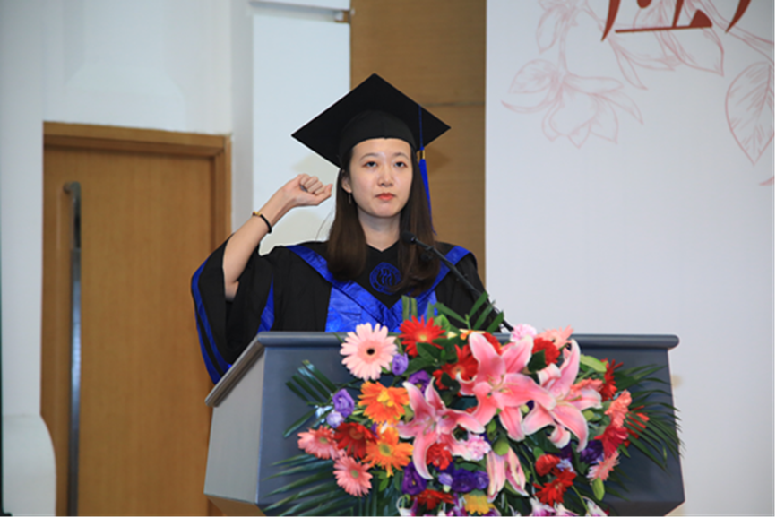 “明德博学,求是笃行,应时敬学,经世济用”,在2019届产业经济专业硕士毕业生相晨曦带领下,全体毕业生肃立并举起右拳庄严宣誓。誓词铿锵,目光坚定,铮铮誓言展示了公司学子争做国民表率、社会栋梁的赤子之心。