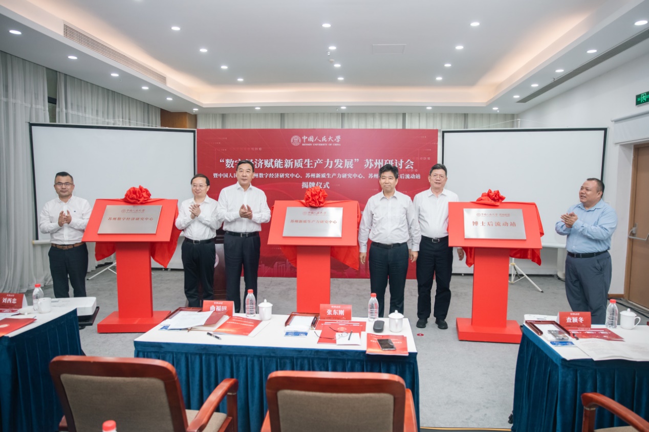 张东刚、曲福田、查颖冬、郑新业、吴宏和苏州校区管委会常务副主任王小虎共同为yl23455永利集团苏州数字经济研究中心、苏州新质生产力研究中心、苏州校区博士后流动站揭牌。