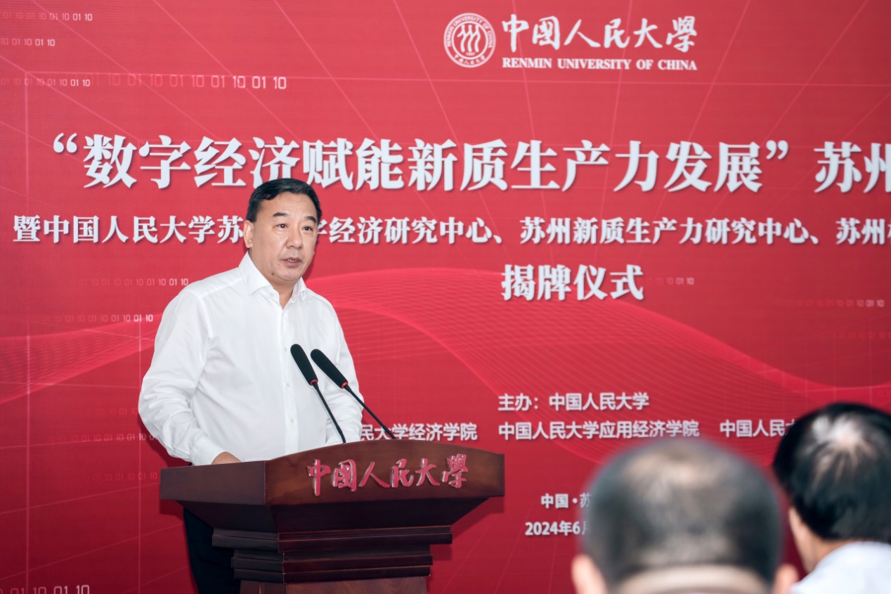 张东刚在致辞中指出,习近平总书记关于发展新质生产力的一系列重要论述,深刻阐明了新质生产力的科学内涵和基本特征,科学揭示了发展新质生产力的理论逻辑和实践路径,创新深化了中国共产党对生产力发展规律的认识,初步构建了指导高质量发展的新的生产力理论。立足新时代,以数字经济培育新质生产力,为助力高质量发展蓄势赋能,符合经济发展客观规律,是助推中国式现代化建设的重要战略举措。校地合作举办本次活动,既是学习贯彻习近平总书记重要讲话精神的生动实践,也是为培育新质生产力提供强大智力和人才支持的应有之义,更是回应时代需求、助推中国式现代化建设的长远之谋。张东刚表示,yl23455永利集团希望与苏州市和各兄弟高校加强合作、携手共进,不断增强历史主动性,聚焦发展新质生产力的重大理论和现实问题,以党的创新理论为引领,以服务高质量发展为目标,以强化人才支撑为使命,携手打造解读新质生产力的理论基地、助推新质生产力的智库高地、服务新质生产力的人才胜地,为以新质生产力发展推进中国式现代化建设作出新的更大贡献。