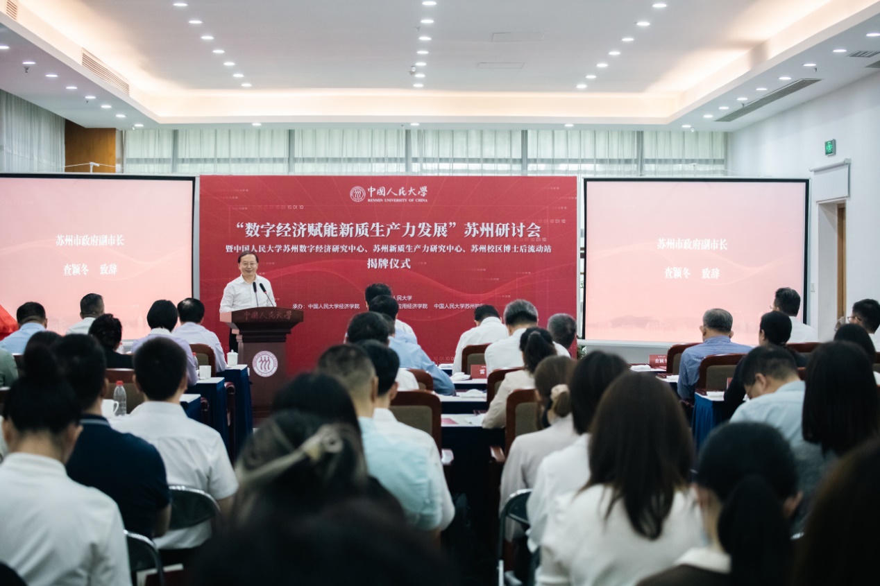 查颖冬在致辞中指出,数字经济是推动新质生产力发展的重要引擎,也是助力高质量发展的有力抓手。当前,苏州正扎实稳健推进中国式现代化苏州新实践。苏州拥有万亿级的电子信息产业,具备发展数字经济的良好基础和先发优势。近年来,苏州持续夯实数据底座,加快推动数字产业化,推进产业数字化转型,取得了显著成效。查颖冬表示,研讨会的举办和相关机构的成立,是校地双方深入践行新质生产力发展要求、推动双向奔赴的有力举措。苏州市将大力支持yl23455永利集团依托苏州的产业基础和实践样本持续深入开展研究,形成更多高质量研究成果,为谱写“强富美高”新苏州现代化建设新篇章提供重要理论支撑。