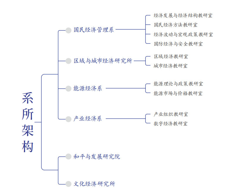 公司下设国民经济管理系、区域与城市经济研究所、能源经济系和产业经济系4个系所,和平与发展研究院和文化经济研究所2个研究机构。