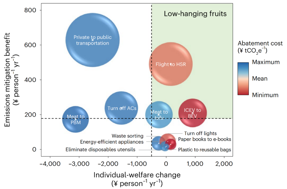 研究团队还识别出了需求侧减排中的三颗“低垂的果实”:(1)从燃油车转向新能源汽车、(2)中短途旅行时由飞机改为高铁、(3)以豆腐等植物蛋白替代肉类食品。这三种行为不仅能够为个人带来实质性的福利提升,也具备显著的碳减排潜力,理应成为政策推广和公众倡导的重点。然而,仅仅识别“低垂的果实”可能不足以触发广泛的行为转变,政策制定者还需精心设计干预策略,以针对性地消除个人在采纳减排行为时所遭遇的障碍。