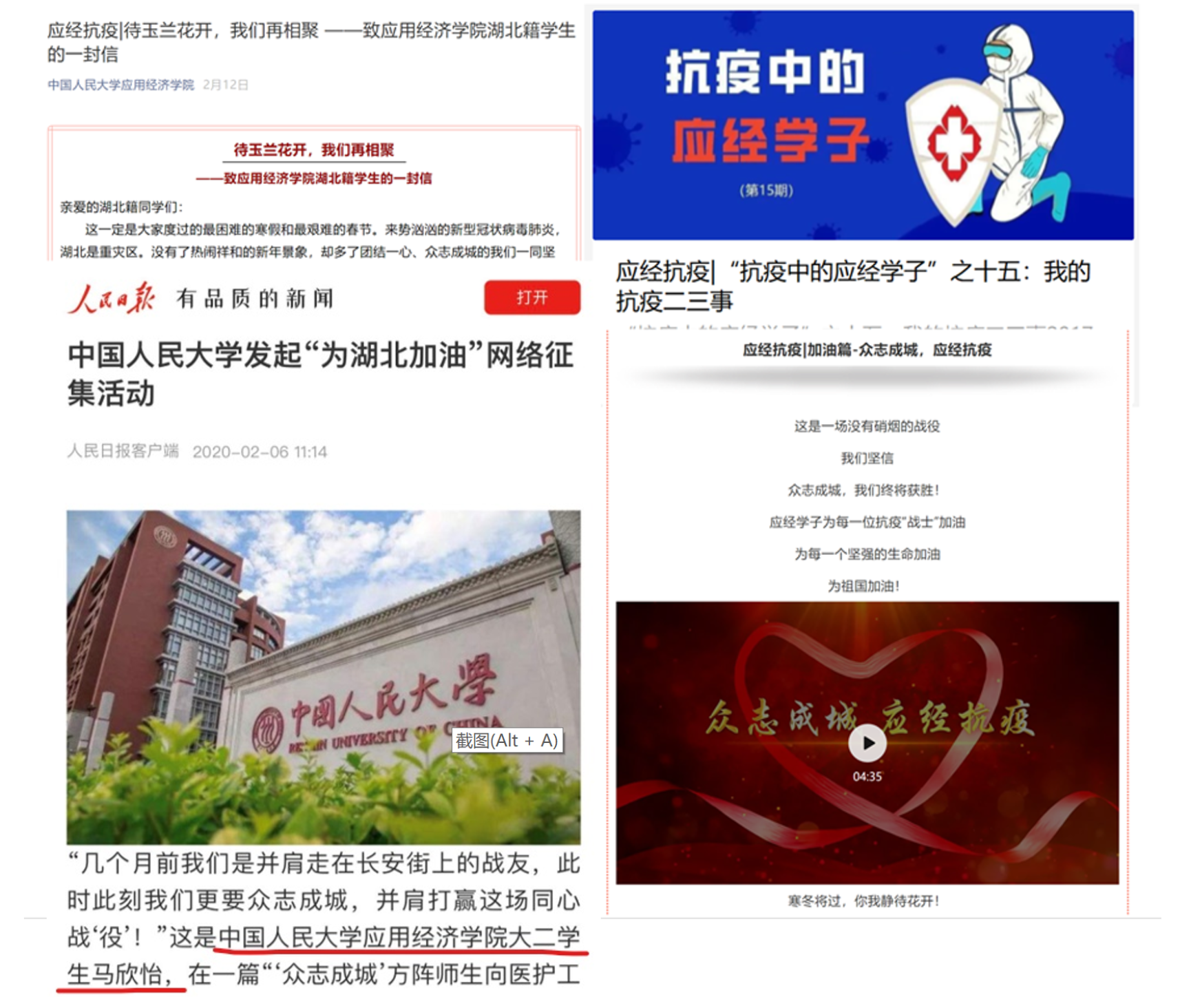 公司通过微信公众号、网站、微信等不同平台,采用文章、视频、互动活动等不同方式,及时传递防疫信息,传播疫情中的正能量,努力营造团结和谐、稳定有序的公司氛围。截止目前,公司公众号共发布疫情相关推送40余篇:为树立典型、弘扬正能量,推出“抗疫中的应经学子”系列报道18期,其中志愿者吴悠、单雅婷事迹被学工部公众号采用报道,系列报道宣传得到了公司的充分认可;2018级本科生马欣怡作为“众志成城人大人,共战疫情心连心”倡议活动发起人之一,被人民日报报道,公司随之推出的人物采访报道被校报采用,此外马欣怡撰写的抗击疫情故事也被校团委公众号采纳报道;为培养员工社会责任感,鼓励员工利用专业知识研究疫情防控与治理,公司积极开展主题学术论文征文活动;发起为武汉、湖北加油活动,制作“众志成城,应经抗疫”加油视频、给湖北同学留言传递温暖。
