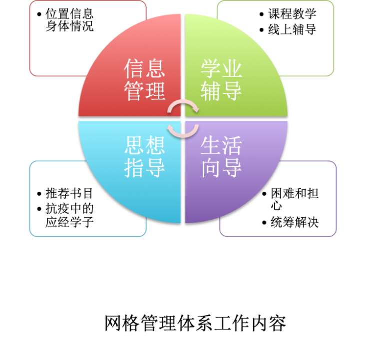 创立经纬交汇、信息直报的横纵双向多维度网格管理体系,确保一线数据信息实现师生双覆盖。依托班级的横向沟通联络机制和各类导师为主体的纵向沟通联络机制,公司每日核实每位员工情况,一一访查;同时,公司建立湖北同学单独微信群、国际员工单独微信群等微信群,实现信息直报。横、纵全口径网格化管理,确保实现班主任、辅导员和每一位导师双监督,压实了责任压实了工作;实现了全部员工数据信息横纵两个渠道的交互印证、双向校准,凸显网格管理模式的科学化,实现与学工体系交互数据100%吻合。