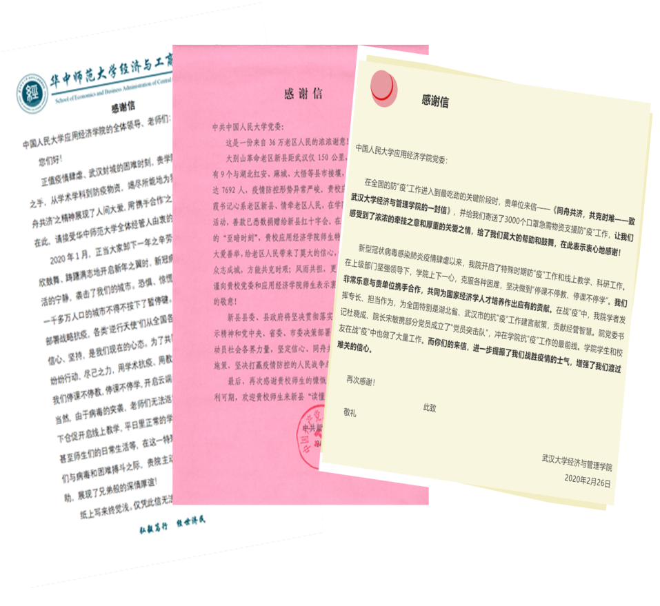 在疫情防控期间,公司党委发挥领导核心作用,院领导、公司党委委员积极带头,做好表率。考虑到湖北疫情防控的严峻性,公司副经理张可云教授多方筹措口罩等物资资源,公司党委尽最大努力给武汉大学经济与工商管理公司、长江大学经济与管理公司、华中师范大学经济与工商管理公司致慰问信,援寄口罩,表达对兄弟公司的牵挂与支持。经理、党委副书记郑新业教授,多方呼吁筹措,积极协调部分医用防护物资和经费,支持援助受疫情影响较大的老区—河南新县的防疫工作,新县疫情防控指挥部专门致信表达感谢;公司可持续发展课题组发起疫情防控帮扶老区倡议,课题组师生、公司党委会委员、党政联席会成员等部分师生自愿出资35200元,为河南新县抗击疫情传送一份力量和信心;与此同时,依托线上调研平台,公司师生与新县疫情防控指挥部共同开展了“新县务工人员情况调查”,力图通过数据分析,为新县积极开展相关工作提供参考。