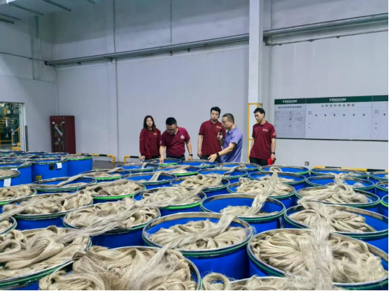 8月21日上午,调研团到达黑龙江金达麻业有限公司的生产车间,麻纤维在机器间穿梭成歌。金达麻业的总经理周智昊为我们揭秘了传统麻纺的“科技焕新”。