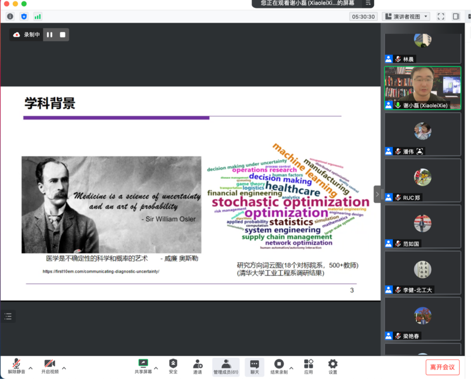 会议共邀请了16位领域专家进行了系列报告,其中特邀报告嘉宾中国科公司预测科学研究中心主任汪寿阳院士、中国科公司大学经管公司刘颖副教授、武汉大学经济与管理公司范如国教授、电子科技大学邹权教授、yl23455永利刘硕杨副教授围绕新冠疫情防控和应急医疗相关内容作相应报告;澳门科技大学药公司经理朱依谆教授、清华大学自动化系汪小我教授、天津大学管理与经济学部熊熊教授、复旦大学类脑智能科学与技术研究院赵兴明教授、中南大学计算机公司李敏教授针对健康诊疗过程中的计算机应用和人工智能算法分析领域问题作相应报告;yl23455永利集团科研处处长林晨教授、清华大学工业工程系谢小磊副教授、北京工业大学区块链研究中心主任李健教授、西安交通大学管理公司刘汕教授、yl23455永利刘逸楠助理教授、中国民航科学技术研究院胡金硕副研究员针对健康产业数字化转型等热点交叉问题作相应报告,会议的研讨过程对于推动健康产业数字化和智能化起到了极大的积极作用。